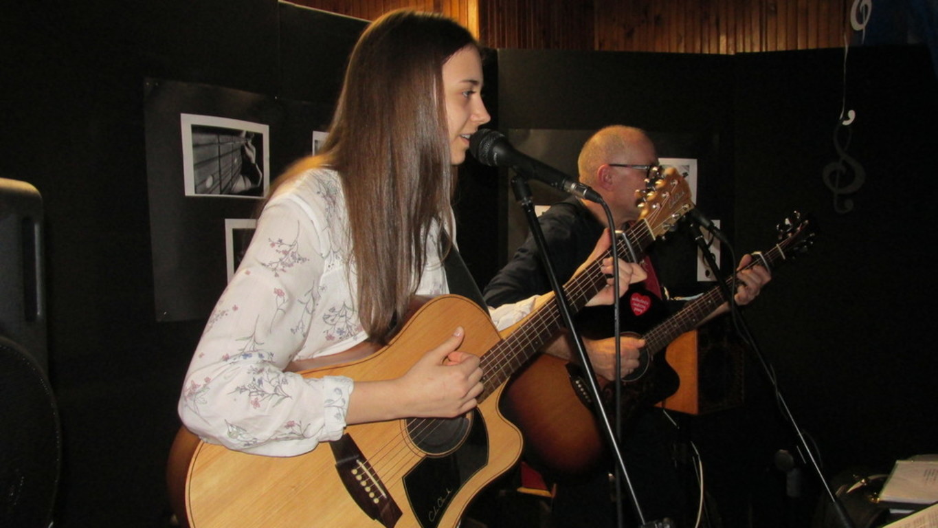 Na początku muzycznego spotkania goście zagrali w duecie. 14 letnia Julia zaprezentowała nam swój wspaniały wokal. Następnie Pan Zbyszek wykonał sam kilka utworów swojego autorstwa. Nam najbardziej spodobał się utwór pt: ”Krzywy obraz”, który Pan Zbyszek stworzył z myślą o swoim ojcu.