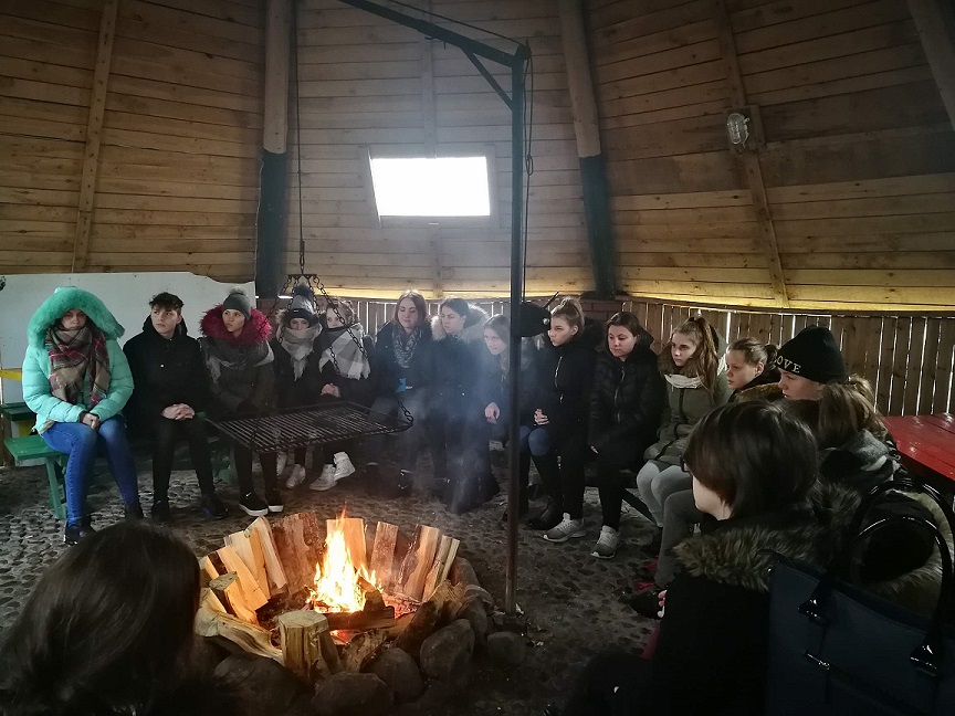 W sobotę, 27 stycznia uczestniczyłyśmy w wycieczce do lasu w Boruszynie. Gdy dotarłyśmy na miejsce czekali na nas myśliwi z Koła Łowieckiego „Darz Bór” z pyszną grochówką i rozpalonym ogniskiem w tipi. Zanim wybrałyśmy się na spacer, najadłyśmy się do syta słuchając opowieści o działalności Koła Łowieckiego. Następnie wędrując, podziwiałyśmy nie tylko piękno lasu, ale przede wszystkim wypatrywałyśmy tropów zwierząt. I znalazłyśmy je… tropy dzików, saren, ślady leśnych ptaków. Nasza koleżanka znalazła nawet poroże koziołka. Pan Tomasz - myśliwy i pan Mariusz prezes Koła Łowieckiego „Darz Bór”, którzy towarzyszyli nam przez cały czas, objaśniali jak rozróżniać tropy zwierząt. Wiemy też, w jaki sposób zwierzęta oznaczają swoje terytorium. Później dotarliśmy do paśnika i lizawki, wyjaśniono nam dlaczego zimą myśliwi wykładają zwierzętom lizawki, czyli bryły soli. Następnie dotarliśmy do strzelnicy, myśliwi zaprezentowali nam jak celnie strzelają do tarczy, która była bardzo daleko. Po spacerze w tipi czekały na nas upieczone kiełbaski. Na zakończenie naszego spotkania pan Mariusz wręczył nam prezent, książkę i podziękował za miłe spotkanie. Po miło spędzonym dniu w lesie w doskonałych nastrojach wróciłyśmy do Ośrodka. Serdecznie dziękujemy organizatorom z Koła Łowieckiego „Darz Bór”, za książkę, mile spędzony czas oraz za przygotowanie ogniska, kiełbasek i pysznej grochówki.
